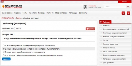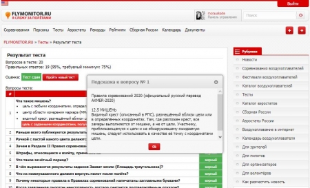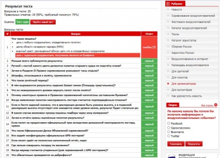 Также по инициативе профильных комитетов и рабочих групп ООО «ФВР», региональных спортивных федераций, организаторов семинаров по воздухоплавательному спорту будут создаваться и открываться в доступ другие категории тестов. Например, тест по материалам семинара или тест для сдачи зачета для присвоения (подтверждения) квалификационной категории спортивного судьи. Подробнее об этом в завершении настоящей статьи.