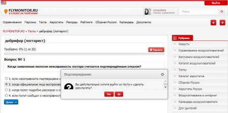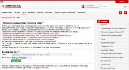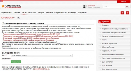 Указанный раздел предназначен для проверки своих знаний спортивными судьями, спортсменами по воздухоплавательному спорту, прохождения тестирования по итогам семинаров, а также сдачи квалификационных зачетов для присвоения (подтверждения) квалификационной категории спортивного судьи.