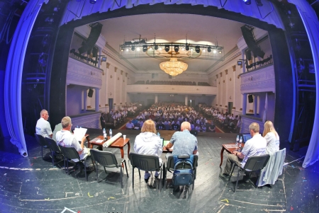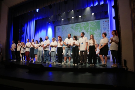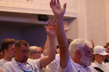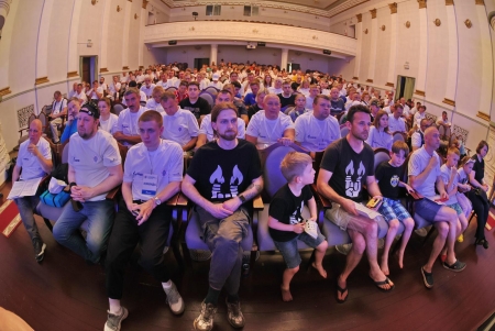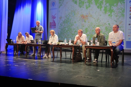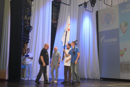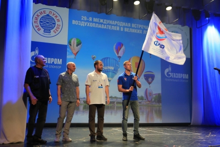 Под громкие аплодисменты зала на сцену был вынесен Флаг Федерации воздухоплавательного спорта России. И честь совершить этот почетный ритуал выпала человеку-легенде - Сергею Леонидовичу Виноградову, победителю Чемпионата России 2000, 2001 и 2002 годов!