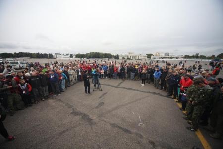Регистрация, ген. брифинг, предполетный брифинг, выезд на место общего старта - аэропорт "Минск 1". Погода плохая ветер, морось, низкая облачность. Полет отменен. Ситуацию спасают белгородские аэромоделисты, получая заслуженное СПАСИБО от зрителей.